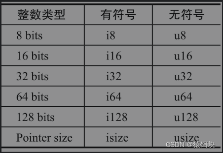 每个有符号变体可以存储从 -2^(n - 1) 到 2^(n - 1) -1的数字,其中 n 是变体使用的位数。因此,可以存储从 -(2^7) 到 2^7 - 1 的数字,等于 -128 到 127。无符号变体可以存储从 0 到 2^n - 1 的数字,因此可以存储从 0 到 2^8 - 1 的数字,等于 0 到 255。
