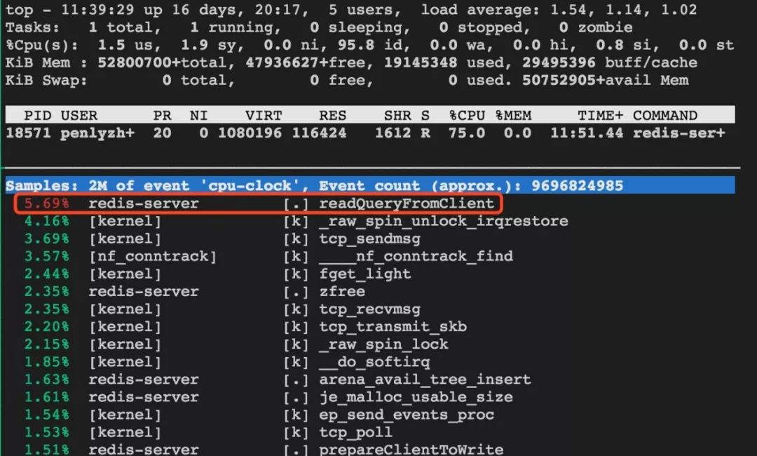 对redis-server分析,发现占用CPU最高的是readQueryFromClient,即主要是在处理来自用户端的请求。