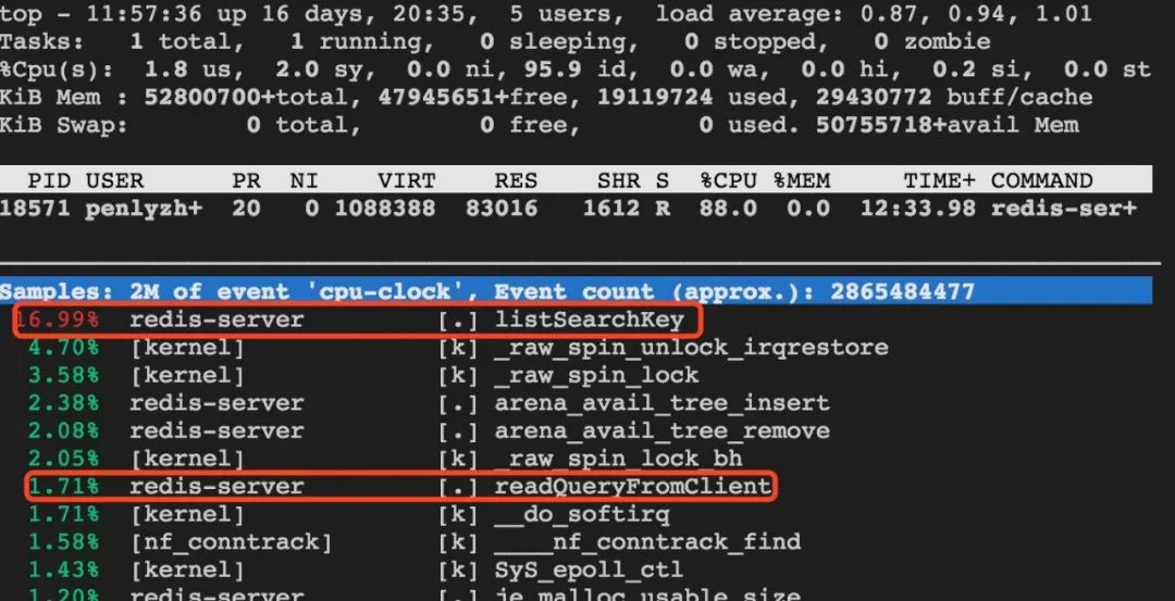 上机器对redis-server进行perf分析,发现函数listSearchKey占用CPU比较高,分析调用栈发现在释放连接时会频繁调用listSearchKey,且用户反馈说是使用的短连接,所以推断是频繁释放连接导致CPU占用有所升高。
