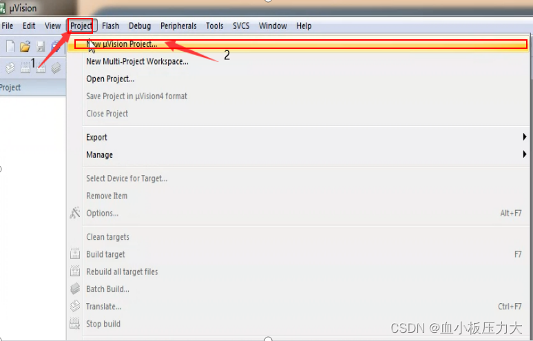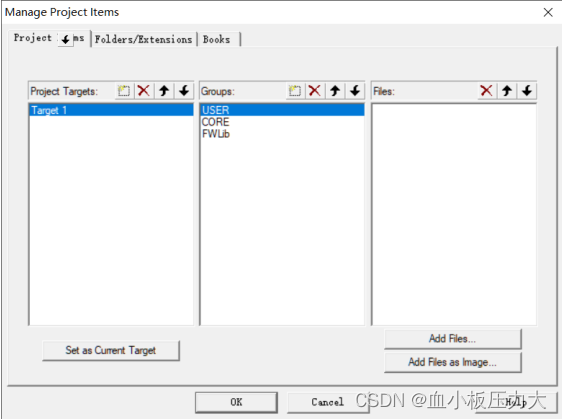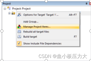 10) 完成前面的步骤后,那我们如何将这些相关的库文件导入工程目录下,因为我的资源里面已经将相关的库文件导入了工程目录,下面我将工程目录里的相关工程删去,重新展现导入的步骤,我们将需要的固件库相关文件复制到了我们的工程目录下面,下面我们将 这些文件加入我们的工程中去。右键点击 Target1,选择 Manage Project Items。