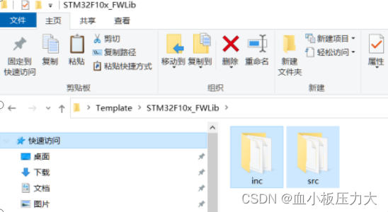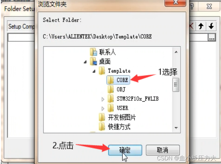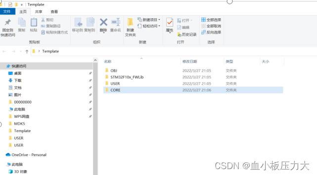 1)在建立工程之前,我们建议用户在电脑的某个目录下面建立一个文件夹,后面所建立的工程都可以放在这个文件夹下面,这里我们建立一个文件夹为 Template,在Template文件夹下创建USER,CORE,,OBJ,STM32F10x_FWLib.CORE 用来存放核心文件和启动文件,OBJ 是用来存放编译过程文件以及 hex 文件,STM32F10x_FWLib 文件夹用来存放 ST 官方提供的库函数源码文件。