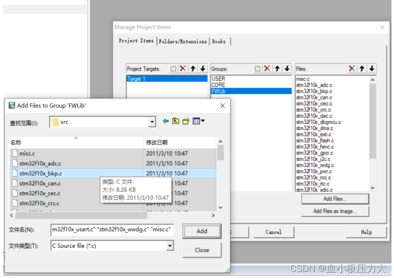 12)下面我们往 Group 里面添加我们需要的文件。第一步我们选择 FWLIB , 然 后 点 击 右 边 的 Add Files, 定 位 到 我 们 刚 才 建 立 的 目 录 STM32F10x_FWLib/src 下面,将里面所有的文件选中(Ctrl+A),然后点击 Add,然后 Close. 可以看到 Files 列表下面包含我们添加的文件。