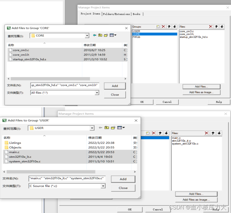 13)用同样的方法,将 Groups 定位到 CORE 和 USER 下面,添加需要的文件。这里我们的 CORE 下面需要添加的文件为 core_cm3.c,startup_stm32f10x_hd.s (注意,默认添加的 时候文件类型为.c,也就是添加 startup_stm32f10x_hd.s 启动文件的时候,你需要选择文件类型 为 All files 才能看得到这个文件),USER 目录下面需要添加的文件为 main.c,stm32f10x_it.c, system_stm32f10x.c. 这样我们需要添加的文件已经添加到我们的工程中了,最后点击 OK,回到工程主界面。