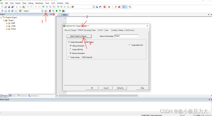 14)接下来我们要编译工程,在编译之前我们首先要选择编译中间文件编译后存放目录。 方法是点击魔术棒