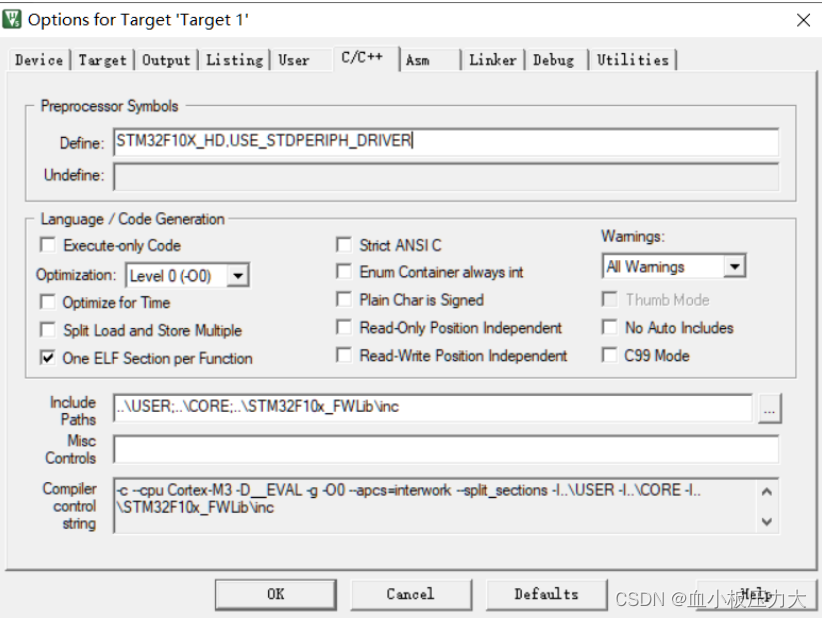 16)定位到 c/c++界面,然后填写 “STM32F10X_HD,USE_STDPERIPH_DRIVER”到 Define 输入框里面(请注意,两个标识符 中间是逗号不是句号,如果您不能确定您输入的是正确的,请直接打开我们光盘任何一个 库函数实例,然后复制过来这串文字即可)。这里解释一下,如果你用的是中容量那么 STM32F10X_HD 修改为 STM32F10X_MD,小容量修改STM32F10X_LD. 然后点击 OK。