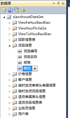 在数据源窗体中把“货品编号”,“货品名称”,“规格”,“单位”拖入窗体