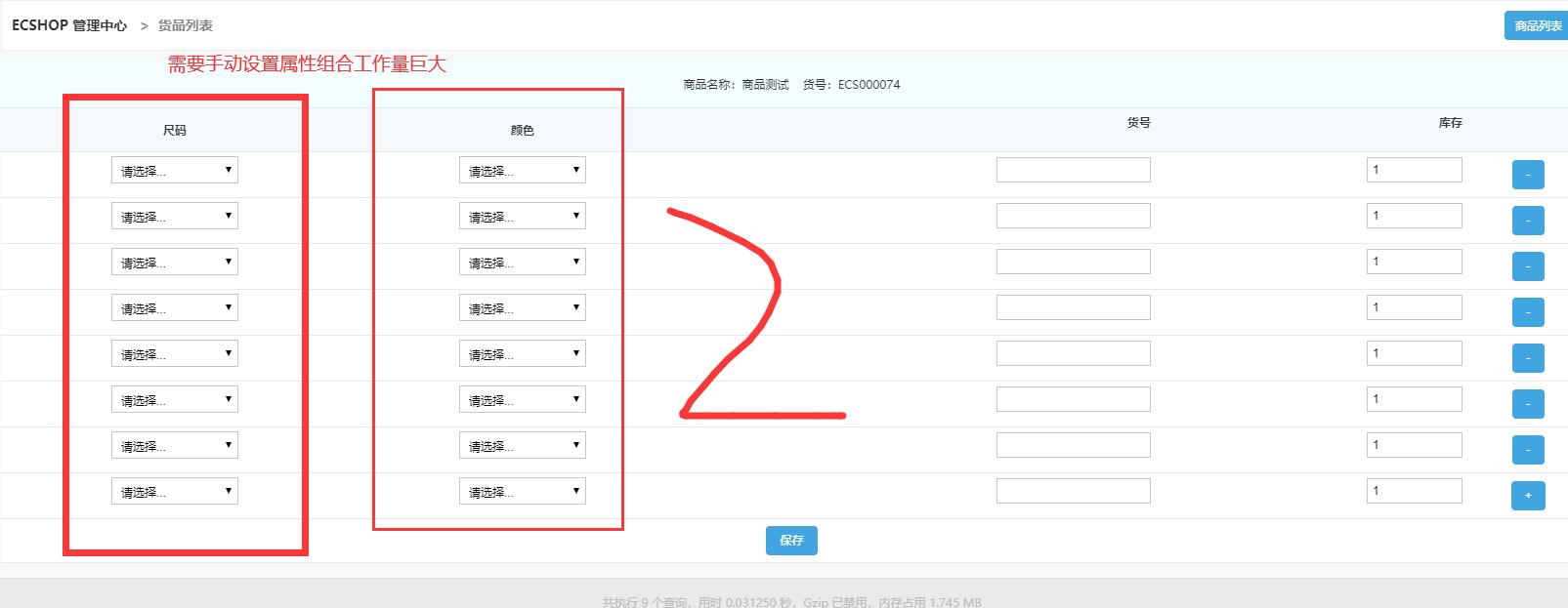 用过ECSHOP商城的用户都知道ECSHOP商城后台添加商品设置好属性后,还需要设置货品列表就是属性组合库存的设置,这个是一个繁琐设置流程,如果是单属性设置还好,如果是双属性设置非常慢。