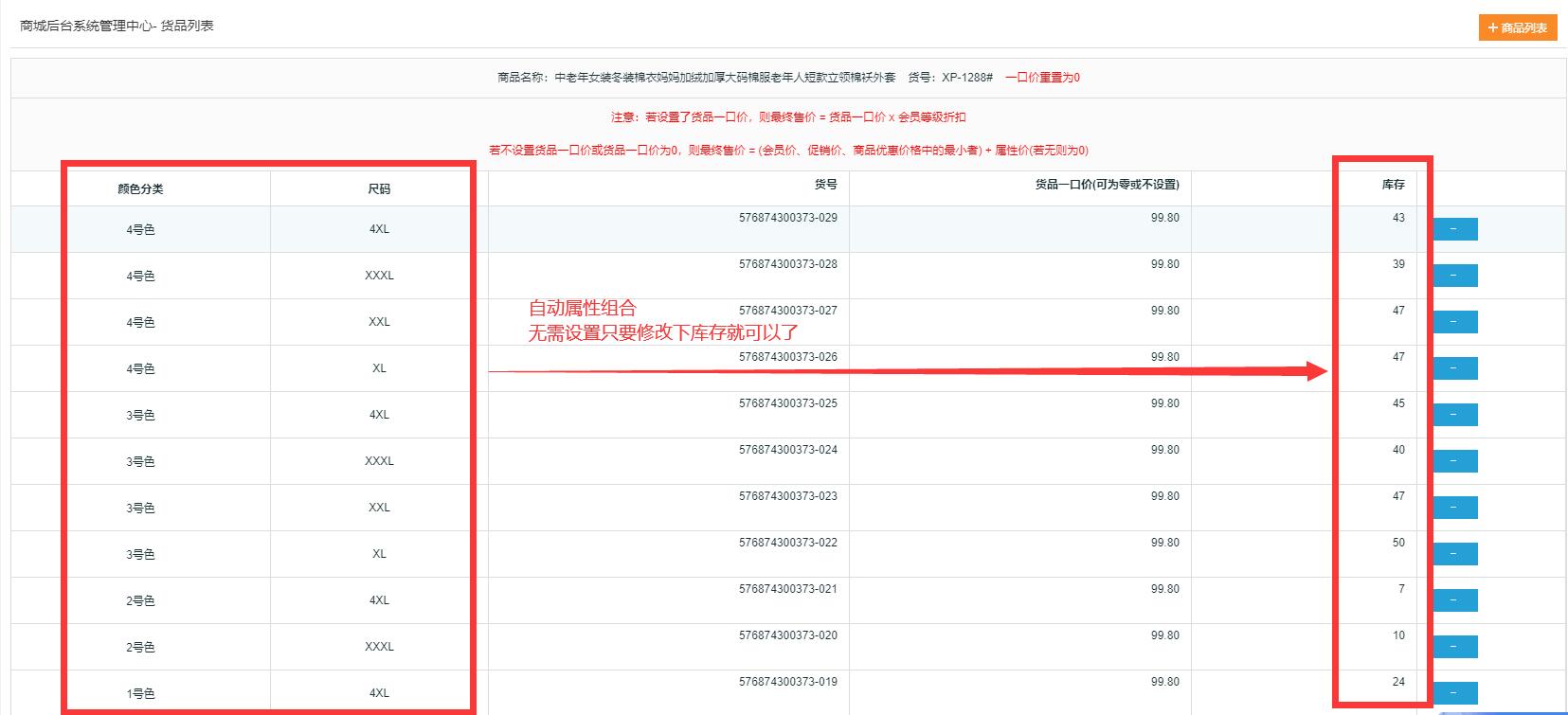 3.自动生成货品库存: 设置好商品属性后,货品列表自动商品属性组合以及自动属性库存