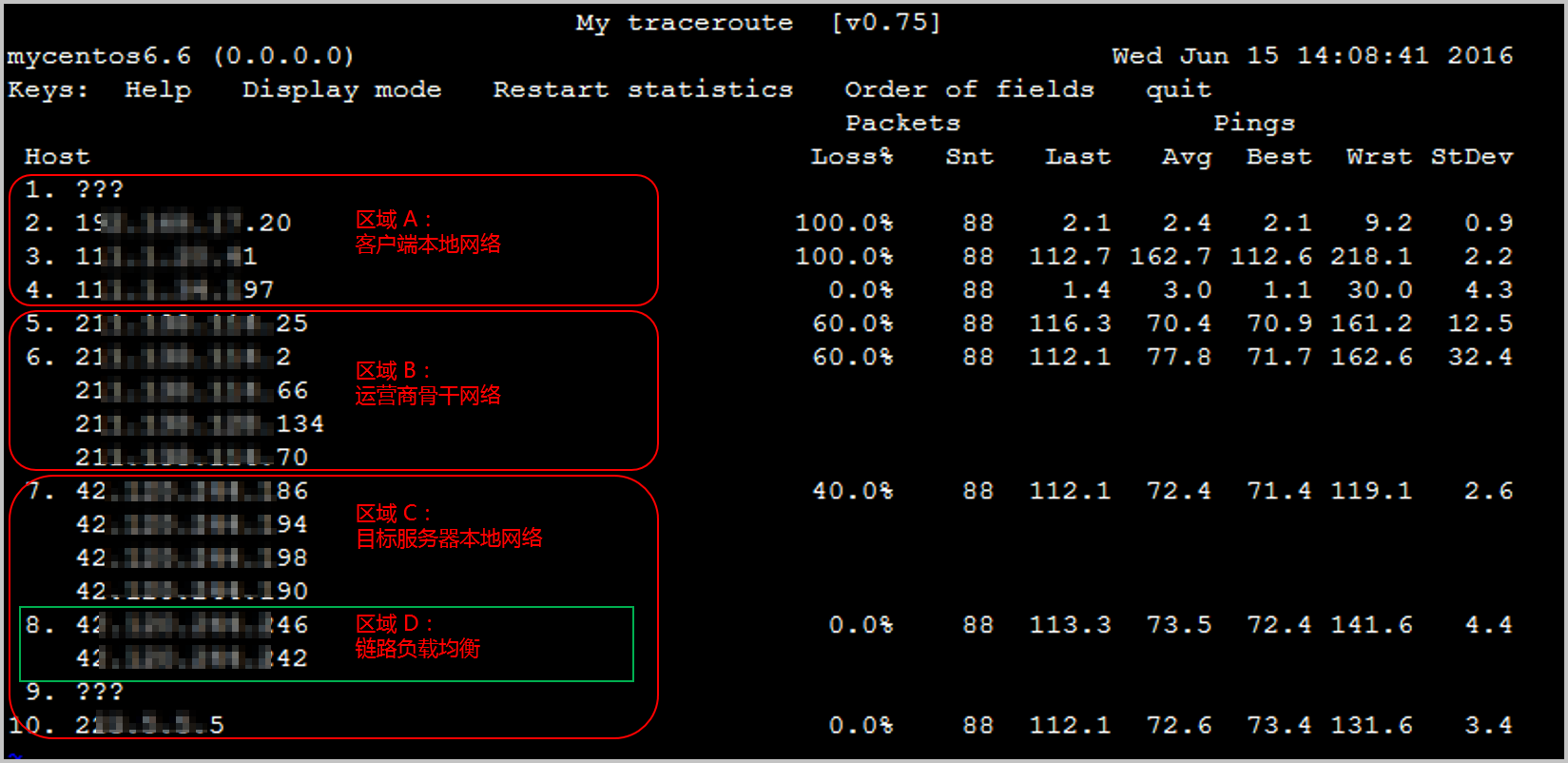 分析2:如区域D所示,若中间链路某些重要部分启用了链路负载均衡,则mtr只会对首尾节点进行编号和探测统计,中间节点只会显示出了相应的IP或域名信息。