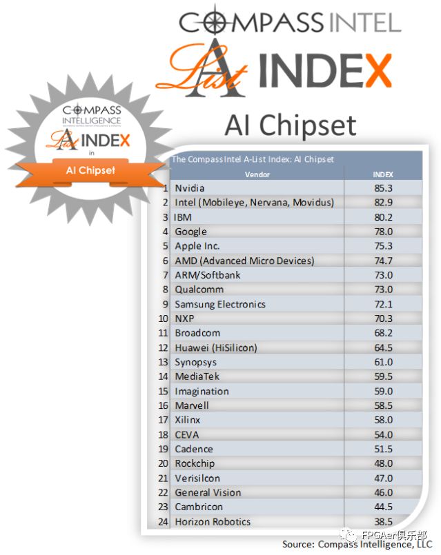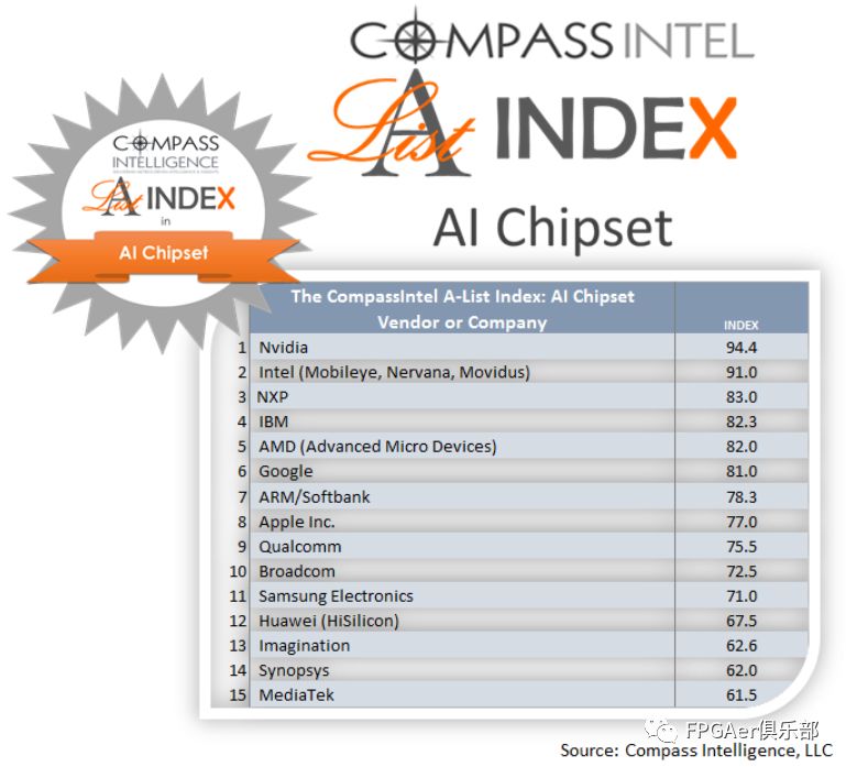 市场研究顾问公司Compass Intelligence发布最新研究结果,公布全球前15大人工智能(AI)芯片企业排名表“A_List”,前三名依序为英伟达(Nvidia)、英特尔(Intel)以及恩智浦(NXP),苹果排名第8名,三星第11名、华为第12名。