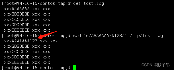 sed 's/AAAAAAA/&123/' /tmp/test.log