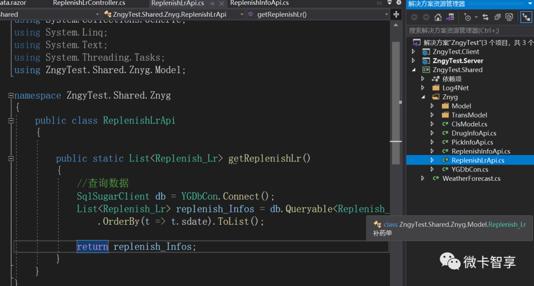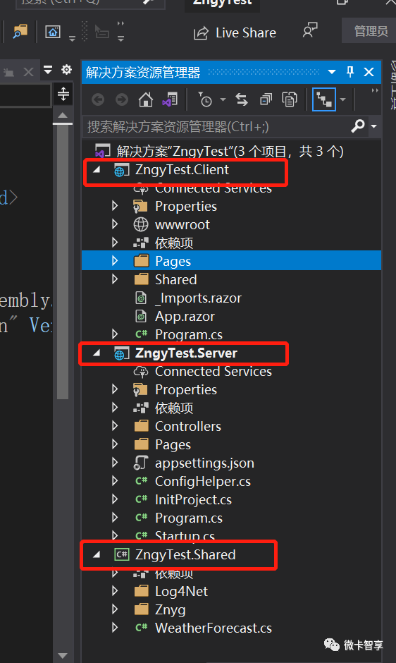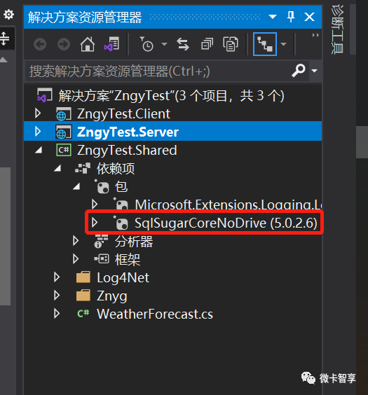 Shared是Client(前端)及Server(后端)同时用到的公共类,上图中红框标注的要加载的NuGet包中,一定要使用SqlSugarCoreNoDrive,因为我在发布程序的时候基于.Net5可移植的方式,开始一直不成功,提示OracleDataAccess.DLL的问题。想到应该是因为WIndows的平台,如果是可移植所以无法打包,于是在NuGet中搜索了SqlSugar,发现有一个NoDrive的包,然后把原来的移除后替换这个,解决了发布的问题。