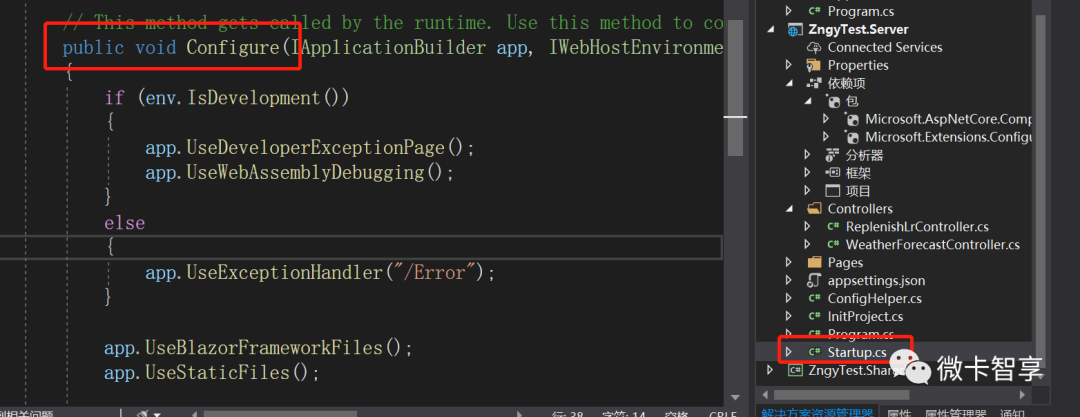 // This method gets called by the runtime. Use this method to configure the HTTP request pipeline.public void Configure(IApplicationBuilder app, IWebHostEnvironment env){if (env.IsDevelopment()){app.UseDeveloperExceptionPage();app.UseWebAssemblyDebugging();}else{app.UseExceptionHandler("/Error");}app.UseBlazorFrameworkFiles();app.UseStaticFiles();app.UseRouting();app.UseEndpoints(endpoints =>{endpoints.MapRazorPages();endpoints.MapControllers();endpoints.MapFallbackToFile("index.html");});InitProject.initZnygConfig();}