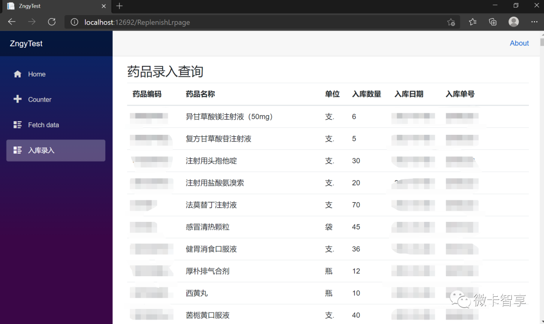 上图中可以看到,原默认生成的Demo里只有前三项,我在菜单栏中又加入了入库录入的一个菜单,并且查询显示出了数据。