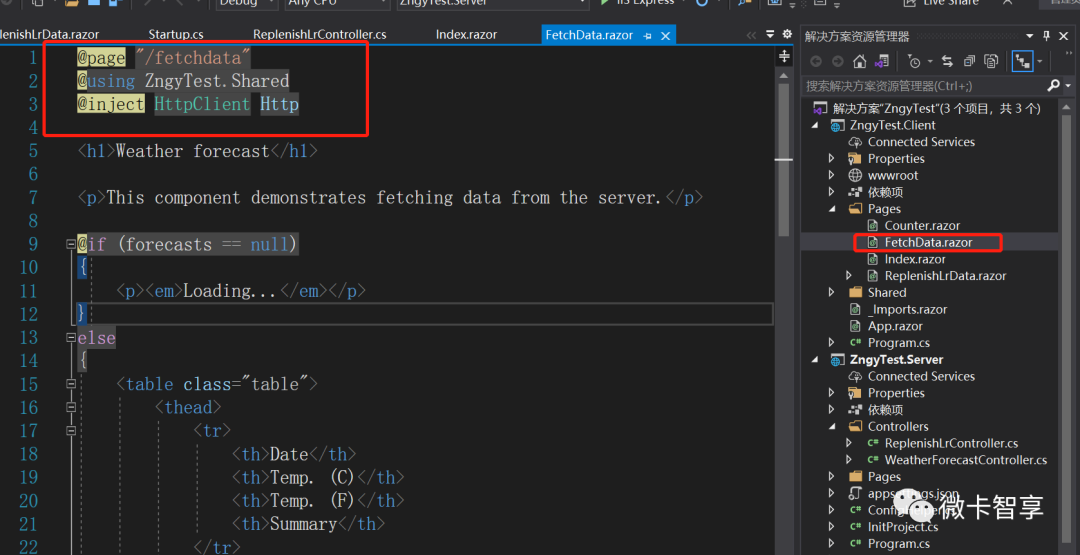 默认天气的Demo中就有向服务端请求Api的方式,里面用到了@inject注入HttpClient的方式请求。