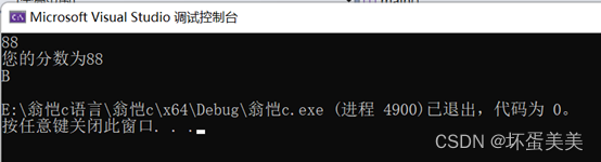 {int score;scanf_s("%d", &score);printf("您的分数为%d\n", score);score /= 10;switch (score){case(10):case(9):printf("A\n");break;case(8):printf("B\n");break;case(7):printf("C\n");break;case(6):printf("D\n");break;default:printf("F\n");break;}return 0;