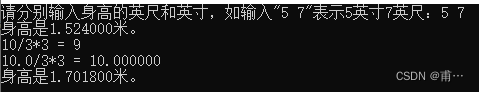 {printf("请分别输入身高的英尺和英寸,""如输入\"5 7\"表示5英寸7英尺:" );int foot, inch;scanf("%d %d",&foot,&inch);printf("身高是%f米。\n",((foot + inch / 12)*0.3048));printf("10/3*3 = %d\n",10/3*3); // 输出结果为9,即10/3=3.333去掉小数部分,为3 3*3=9printf("10.0/3*3 = %f\n",10.0/3*3);// 10 改进为10.0,%d改成%f。printf("身高是%f米。\n",((foot + inch / 12.0)*0.3048));// 12 改进为12.0,%d改成%f。return 0;