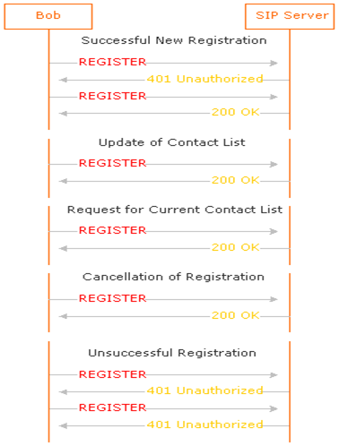 注册流程简单来说就是:客户端发送register请求,服务器通过鉴权判断客户端号码是否存在,如果需要密码就回复401 Unauthorized,如果不需要密码就直接回复200 OK,客户端收到鉴权要求后根据401 Unauthorized携带的编号以及加密协议(例如MD5)将密码添加进去,重新发送register,服务器判断正确后回复200 OK,注册成功。