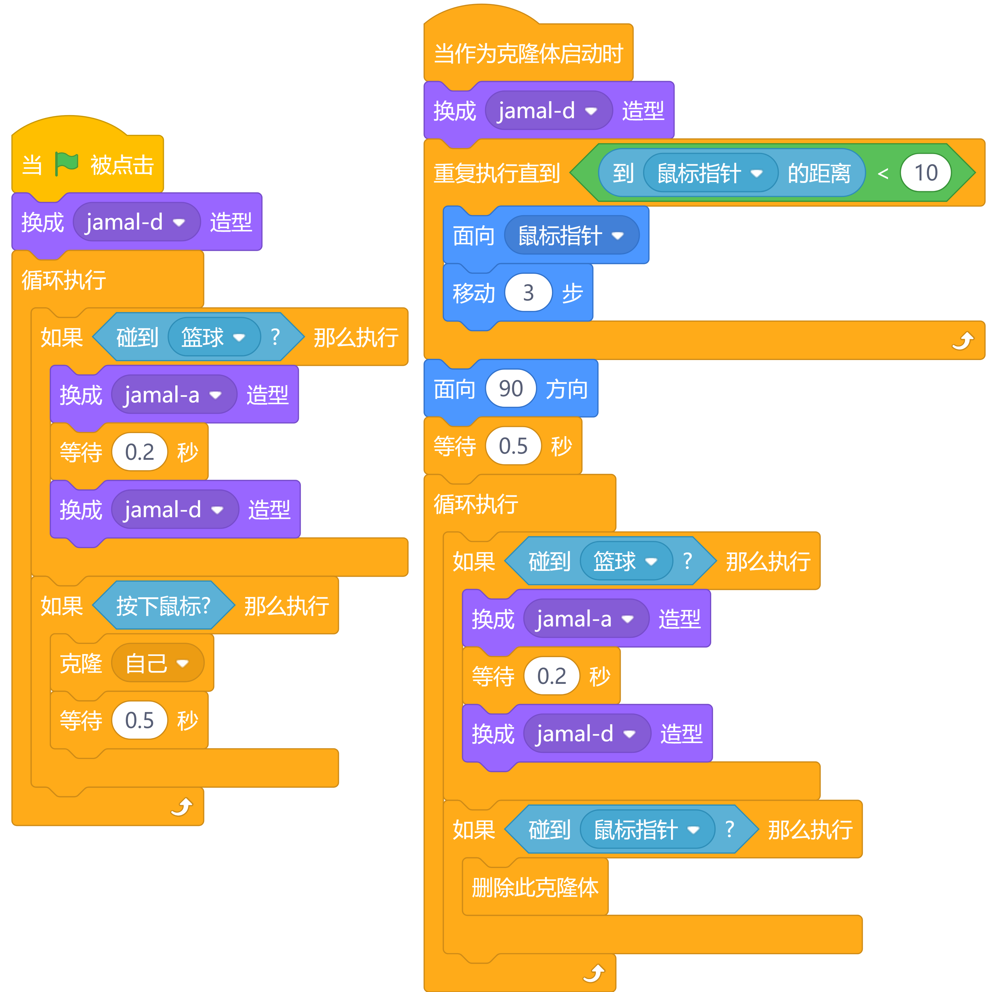 本程序的功能是“篮球”每0.2秒复制,复制后向随机方向移动,碰到边缘反弹,碰到角色“Jamal”后删除且该角色切换到接球动作。每5秒切换背景。鼠标点击后角色“Jamal”复制并移动到鼠标位置,延时0.5秒,复制的角色碰到鼠标后删除。