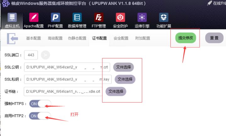 四、选择Apache文件,选择强制HTTPS及启动HTTP2,最后点击提交修改。