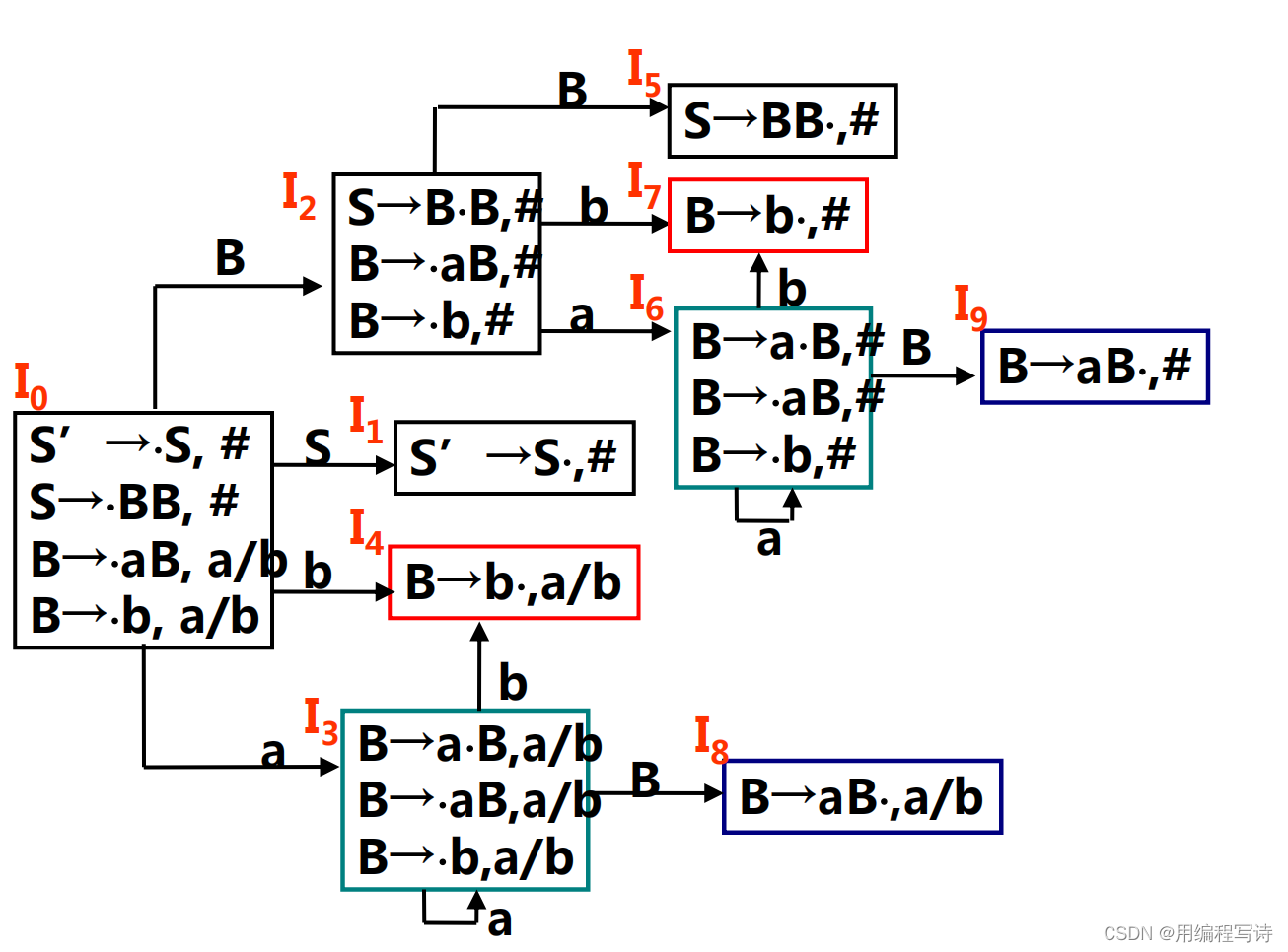 在这里我们可以看到4状态和7状态 8状态和9状态他们只有向前搜索符是不一样的其他都是一样的,那么我们是不是可以把他们转换成一个状态然后把向前搜索符进行合并。