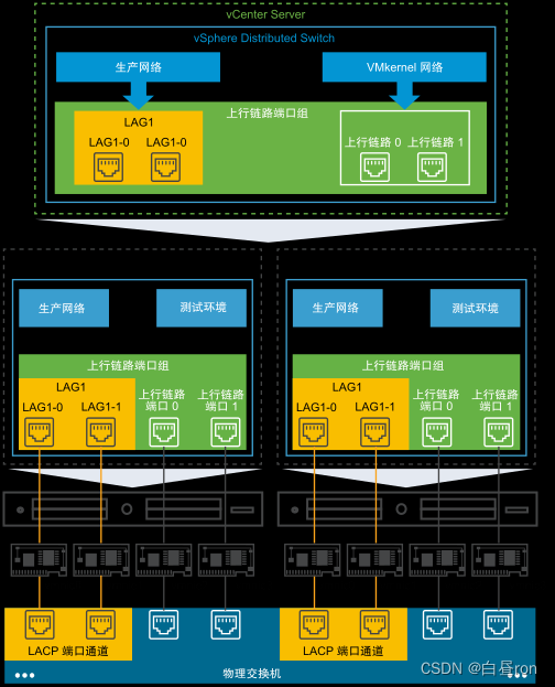 当规划虚拟机业务网络需要用链路聚合时,可以通过创建 vSphere Distributed Switch (分布式交换机)来使用LACP。将ESXi主机上的两个网卡,分别连接到两台堆叠的物理交换机上,在物理交换机上将这两个端口配置为动态链路聚合,在 vCenter上为主机创建分布式交换机,并创建链路聚合组 (LAG),以聚合连接到 LACP 端口通道的物理网卡带宽。