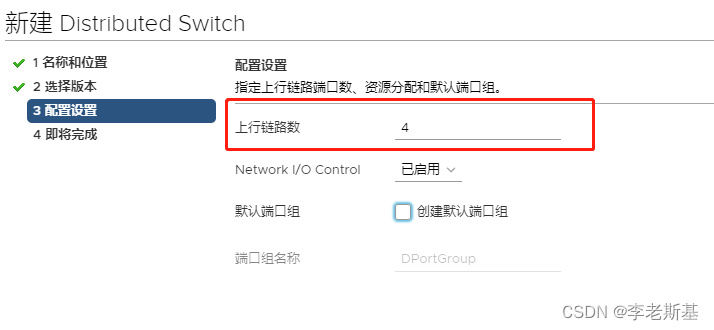 注:上行链路数是一台ESXI主机 所包含的链路数,根据实际需求填写即可;不创建默认端口组。
