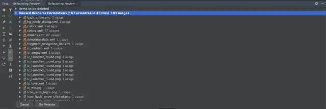 APK 的资源主要包括图片、XML,与冗余代码一样,它也可能遗留了很多旧版本当中使用而新版本中不使用的资源,这点在快速开发的 App 中更可能出现。我们可以通过点击右键,选中 Refactor,然后点击 Remove Unused Resource => preview 可以预览找到的无用资源,点击 Do Refactor 可以去除冗余资源。如下图所示: