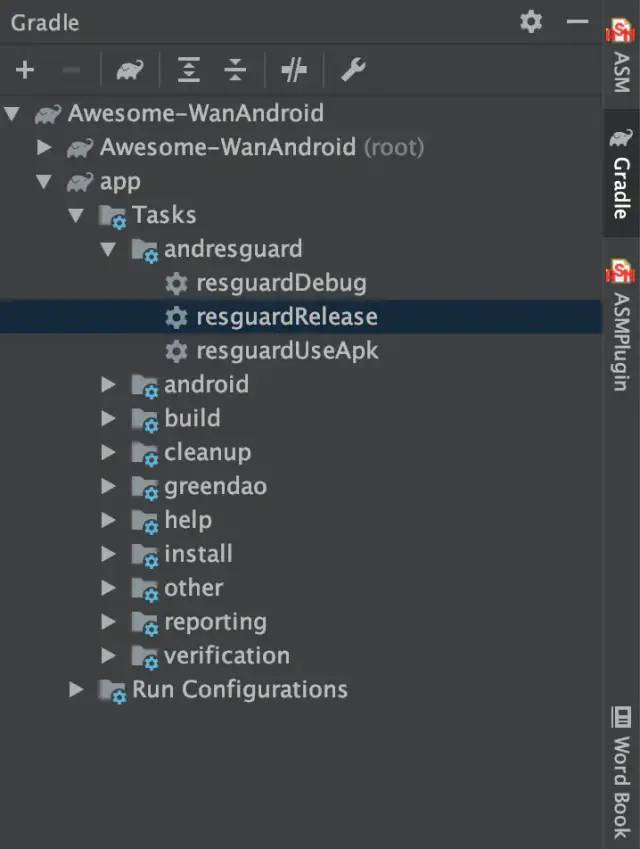 4、最后,我们点击右边的项目 module/Tasks/andresguard/resguardRelease 即可生成资源混淆过的 APK。如下图所示: