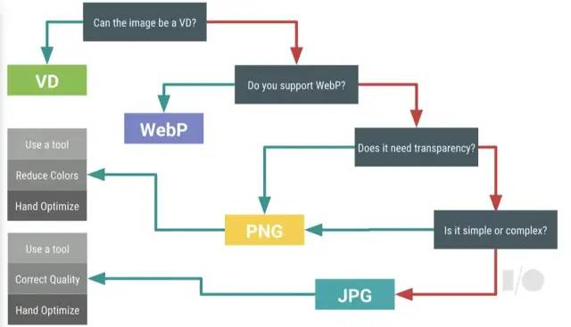 在** Google I/O 2016** 中,讲到了如何选择相应的图片格式。首先,如果能用 VectorDrawable 来表示的话,则优先使用 VectorDrawable;否则,看是否支持 WebP,支持则优先用 WebP;如果也不能使用 WebP,则优先使用 PNG,而 PNG 主要用在展示透明或者简单的图片,对于其它场景可以使用 JPG 格式。简单来说可以归结为如下套路: