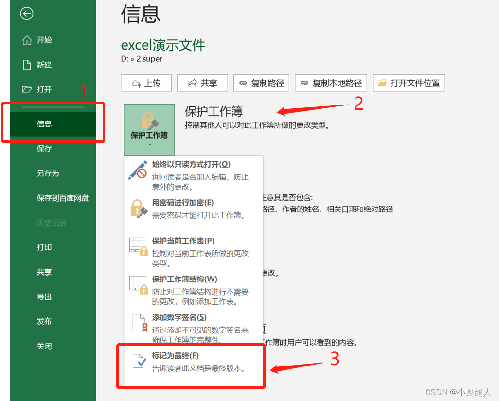 和上面的操作步骤都一样,只是在最后一步的时候,我们选择最下面的选项:标记为最终。这样设置之后的文件打开也将是只读模式。