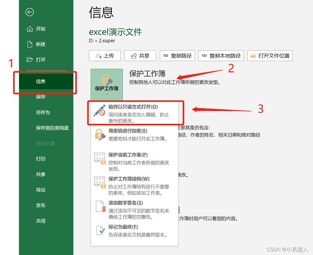 打开文件,我们可以在文件中设置只读模式,点击工具栏中的文件 – 信息 – 保护工作簿 – 始终以只读方式打开。即可将文件设置为只读模式。