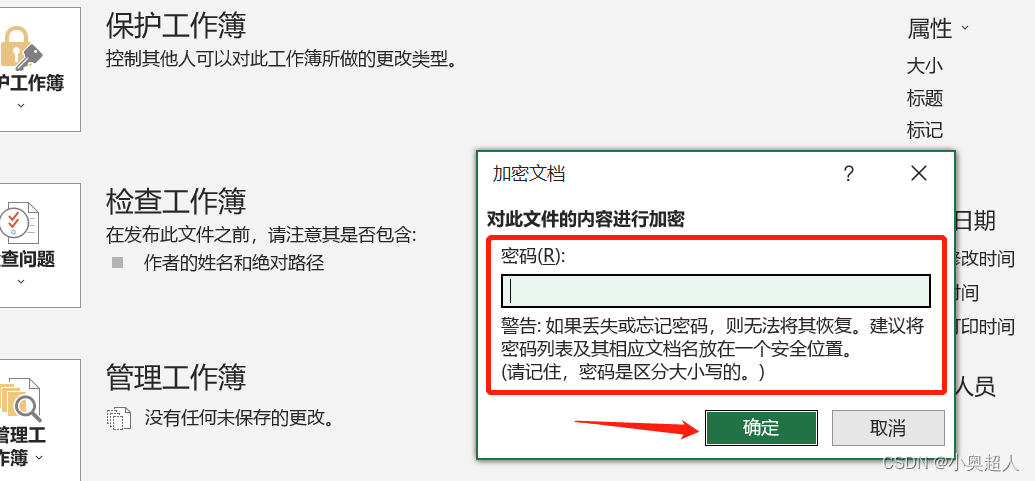 此时会出现加密文档界面,我们在输入框内输入想要设置的密码,点击确定即可完成excel文件的加密。这里需要注意一下输入框下面的文字,大概意思是,忘记密码后无法恢复密码,并且密码区分大小写。所以我们一定要记住自己设置的密码。