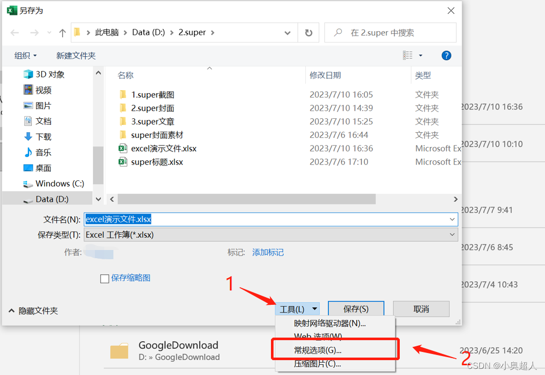 将文件另存为,在选择保存路径的界面中,我们先不急着保存,点击下方的工具按钮,选择常规选项
