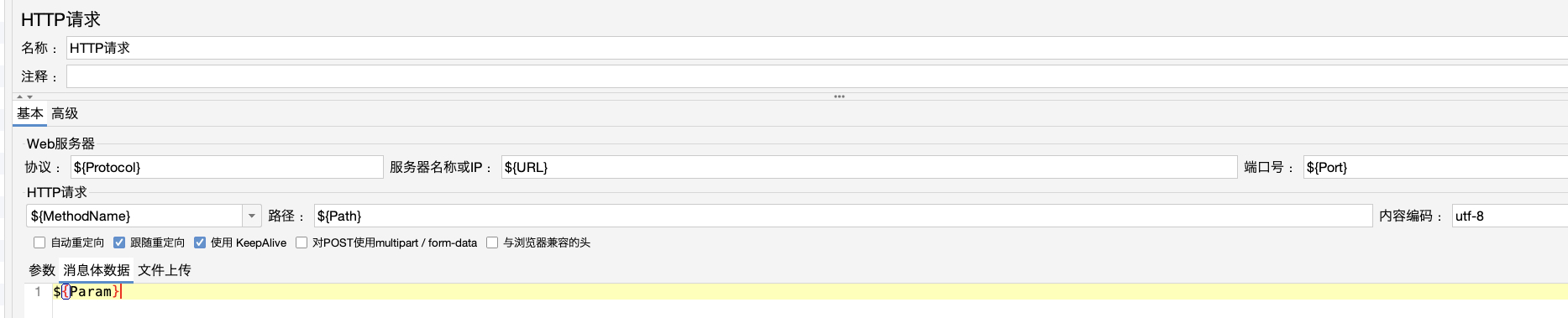 - Http请求配置CSV文件,使用${}符号将CSV配置的数据(或者自定义的),这个地方采用IP+端口(可以便利的实现环境的切换而不用变更文件)使用自定义其他均用CSV配置。