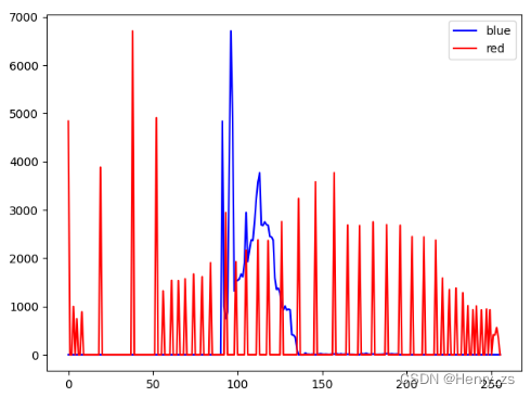 cv库里面的计算直方图的函数为:hist = cv2.calcHist([img],[0],None,[256],[0,256])