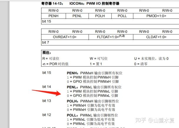 不过我的目标就是要实现这样的功能,是不可以半途而废的,肯定是有变通的办法,在又继续看了一遍IOCONx寄存器的时候,突然想到,可以把PWMxL引脚使用GPIO模块来控制,抛开PWM模块,这样就可以控制PWMxL引脚独立输出低电平了。