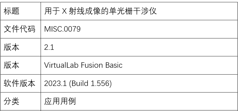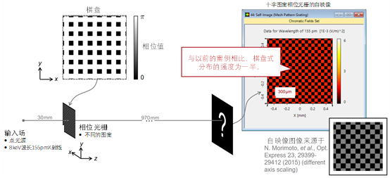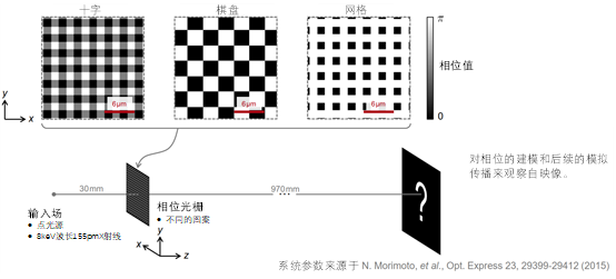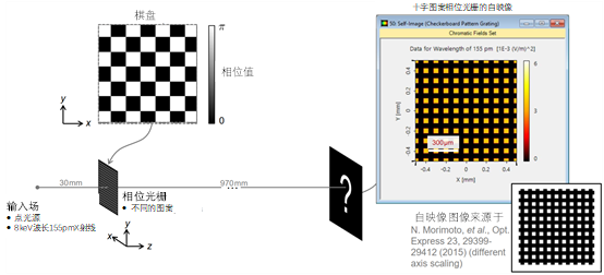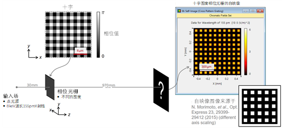 X射线成像通常是基于Talbot效应,以及光栅的周期性自成像。按照N. Morimoto等人的工作,我们选择了三种类型的相位光栅,有十字、棋盘和网状图案。这些光栅在一个单一的光栅干涉仪中被采用,被建模为仅有相位的传输函数(因为X射线的波长比光栅的最小特征尺寸小得多),并且在VirtualLab Fusion中测试它们的自成像。
