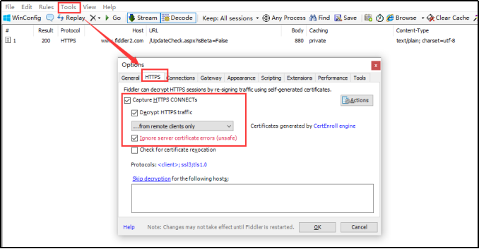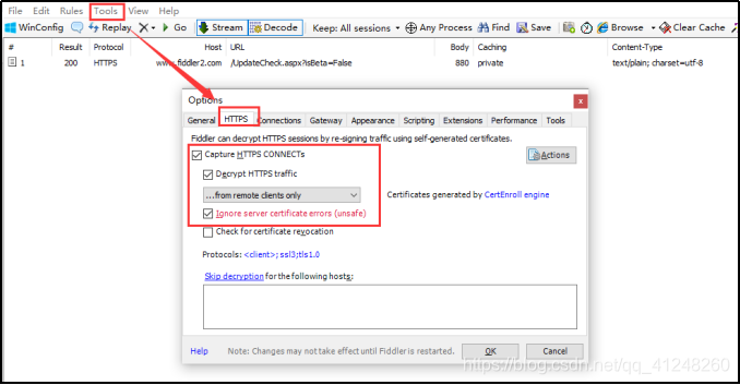 (1)首先打开Fiddler==》选择“Tools”菜单下的“Options”功能==》点击“HTTPS”。并按照截图上的配置(选中"Decrpt HTTPS traffic")。