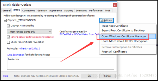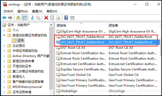 (3)如果需要查看证书:点击Actions下的open windows certificate Manager 按钮。在这里就可以看到证书已经添加进去了,证书名称就是之前提醒大家留意的【DO_NOT_TRUST_FiddlerRoot】