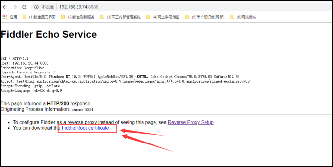 (4)将 Fiddler 代理服务器的证书导到手机上才能抓这些 APP 的包。导入的过程:打开浏览器,在地址栏中输入代理服务器的 IP 和端口(即电脑的IP加fiddler的端口),会看到一个Fiddler 提供的页面,然后确定安装就好了。