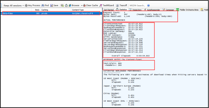 关于HTTP请求的性能和其他数据分析,从中看出一些基本性能数据:如DNS解析的时间消耗是216ms,建立TCP/IP连接的时间消耗是3243ms。同时访问数据是多少字节等信息。