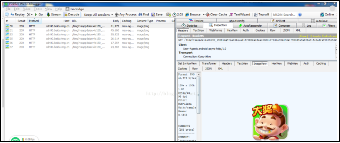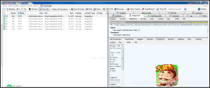 2、打开Fiddler,然后点击棋牌游戏进入上边这个界面,就能发现会请求当前显示的这五张图片