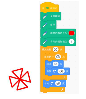 1. 要使以下代码运行后画出如图所示三角形风车,则以下代码中①②③④处应分别填入 多少?()。