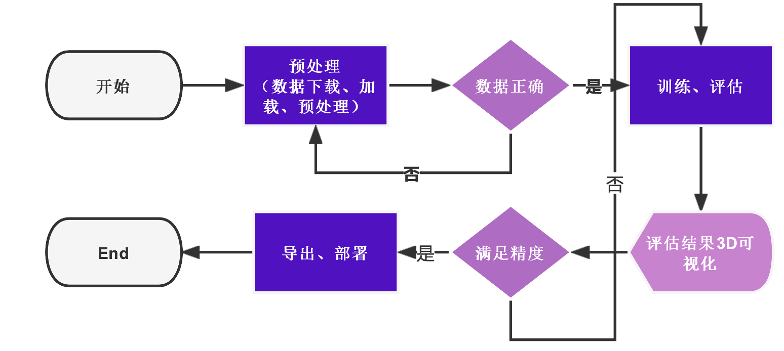 那么MedicalSeg3D具备哪些优点呢?在这里一一为大家展开 ### 全流程覆盖、极简开发 为了更方便的简化流程,首先,通过一键数据预处理,确认数据的正确性,随后开始训练和评估,过程中随时可以查看预测结果的3D可视化,获得满足精度的模型之后,我们对其进行导出和部署,从而获取更快的推理速度为应用服务。 完整的流程图如图所示: