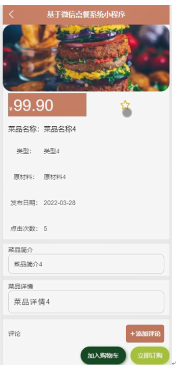 菜品信息,在菜品信息页面可以查看菜品名称、类型、原材料、图片、价格、发布日期、点击次数、菜品简介、菜品详情等信息,并进行加入购物车、立即订购,评论或收藏操作;如图5-4所示。