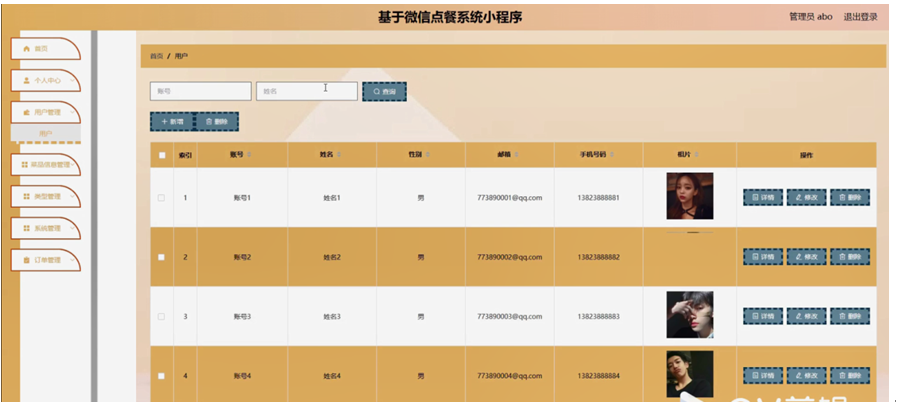 用户管理,在用户管理页面可以对索引、账号、姓名、性别、邮箱、手机号码、相片等内容进行详情、修改或删除等操作,如图5-9所示。