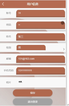 用户信息,在用户信息页面通过填写账号、密码、姓名、性别、邮箱、手机、相片等详细信息进行保存或退出登录操作,如图5-6所示。