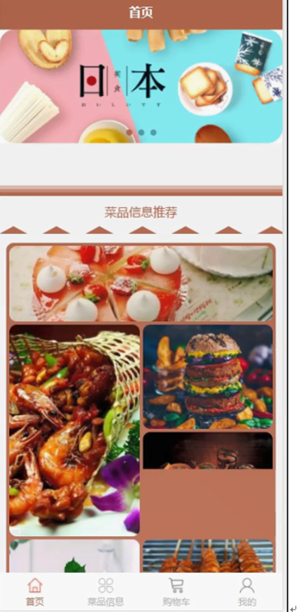 用户登陆系统后,可以对首页、菜品信息、购物车、我的等功能进行详细操作,如图5-3所示。