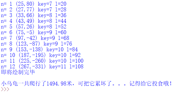 print('\n小乌龟一共爬行了{}米,可把它累坏了。。。记得给它投食哦!'.format(tdis))pu()